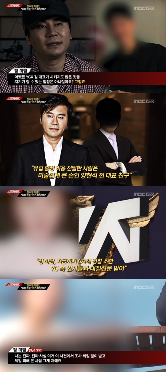 8일 방송된 MBC '스트레이트'에서는 다시 한 번 YG 성접대 의혹에 대해 다룬 가운데, 정마담의 증언이 공개됐다.