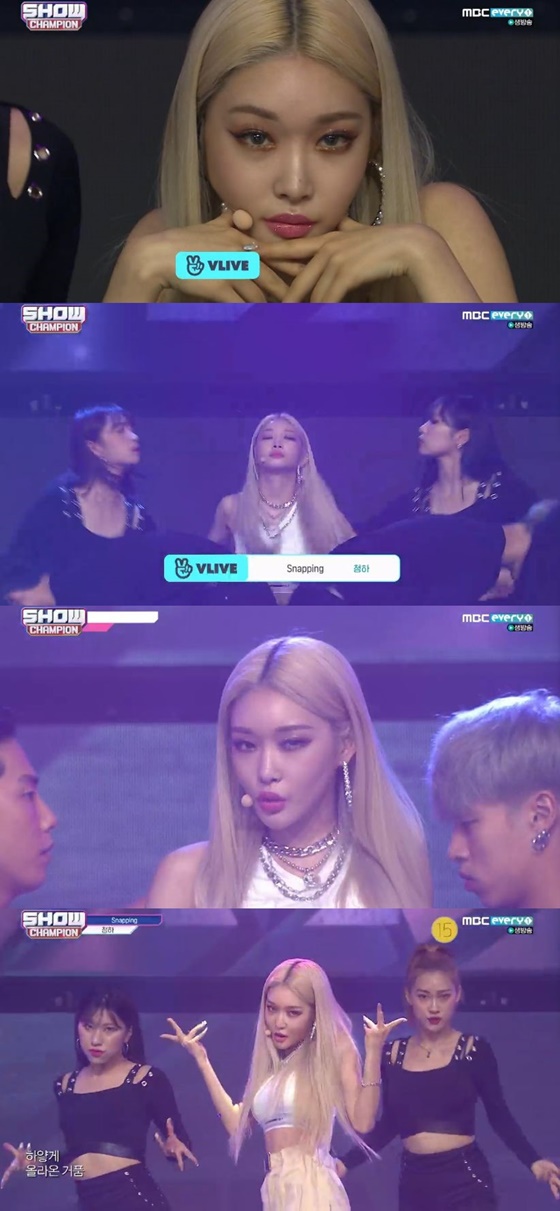 청하는 10일 오후 방송된 MBC뮤직 음악 순위 프로그램 '쇼! 챔피언'에서 앨범 'Flourishing'의 타이틀곡 'Snapping'으로 무대를 꾸몄다.