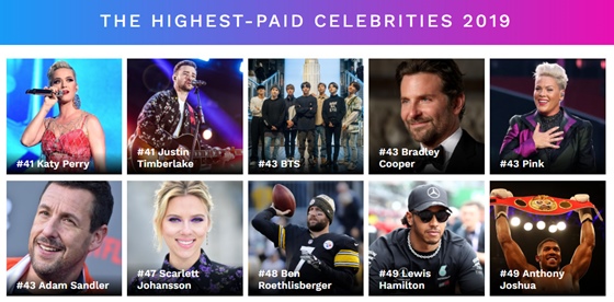 포브스는 10일(현지시간) 공개한 '2019 세계에서 가장 많은 수익을 낸 엔터테이너 100명'(The Celebrity 100-The World's Highest- Paid Entertainers 2019) 순위에서 방탄소년단이 43위를 기록했다고 밝혔다.