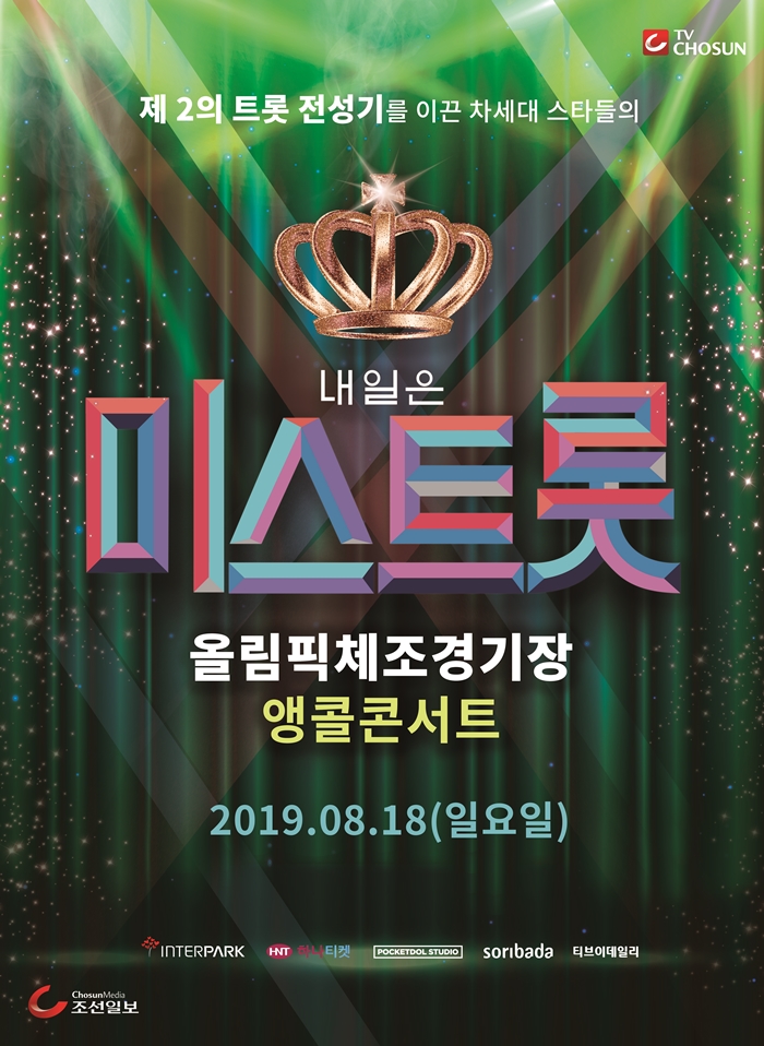 '2019 케이월드 페스타(2019 K-WORLD FESTA)'의 일환으로 오는 8월 18일 서울 송파구 올림픽공원 체조경기장에서 개최될 미스트롯 전국투어 라스트 앵콜 콘서트는 오는 19일 오후 8시 하나티켓과 인터파크 홈페이지를 통해 티켓 오픈한다.