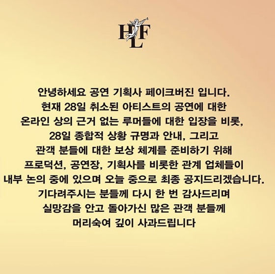 이에 페스티벌을 기획한 공연기획사 페이크버진은 29일 공식 SNS를 통해 "28일 종합적 상황 규명과 안내, 관객분들에 대한 보상 체계 준비를 위해 프로덕션, 공연장, 기획사를 비롯한 관계 업체들과 내부 논의 중에 있으며 오늘 중으로 최종 공지드리겠다"는 입장을 밝혔다.