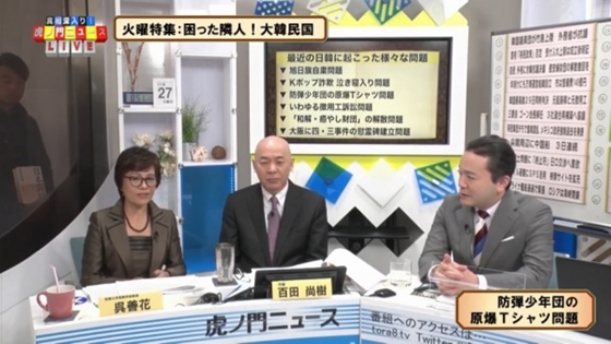 DHC는 최근 한일관계가 나빠지기 전에도 줄곧 혐한 발언들을 쏟아냈다. 이날 방송에서도 출연자들은 방탄소년단을 언급하며 한국을 비하했다.