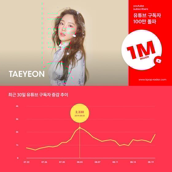 걸그룹 소녀시대 태연의 공식 유튜브 구독자 수가 100만 명을 돌파했다.