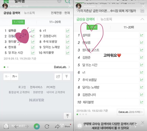 공개된 사진에는 한 포털 사이트 실시간 검색어 1위에 설하윤의 이름이 올라있다. 설하윤은 해당 사진에 하트 이모티콘을 붙이며 감사 인사를 전했다.