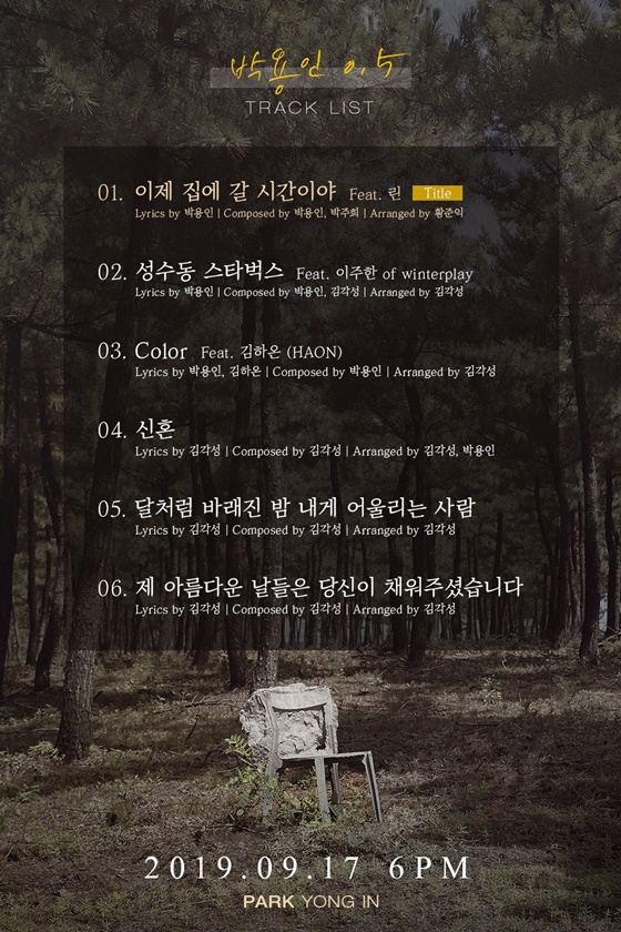 '박용인 0.5'는 어반자카파 멤버로 가요계에 데뷔한 후 10년 만에 선보이는 박용인의 첫 솔로 앨범이다. 박용인만의 독보적이고 매력적인 저음과 깊은 감성으로 빚어낸 음악으로 리스너의 가을 감성을 자극하며 보컬리스트로서의 진가를 발휘할 것으로 기대된다.