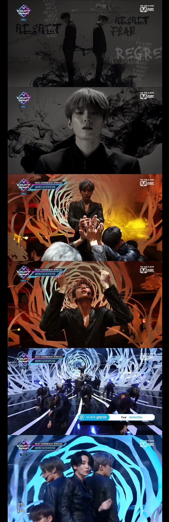 이날 세븐틴의 타이틀곡 '독:Fear'의 무대는 지난 16일 세 번째 정규 앨범 'An Ode(언 오드)'를 발매한 후 음악방송 최초로 선보이는 것.