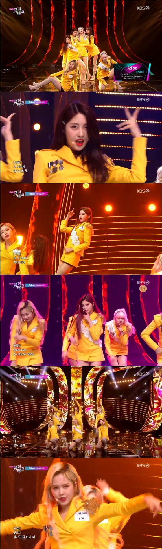 이날 방송에서 에버글로우는 곡 'Adios'에 맞춰 군무를 선보였다. 이들은 옐로우 의상을 착용하고 자신의 매력을 뽐냈다.