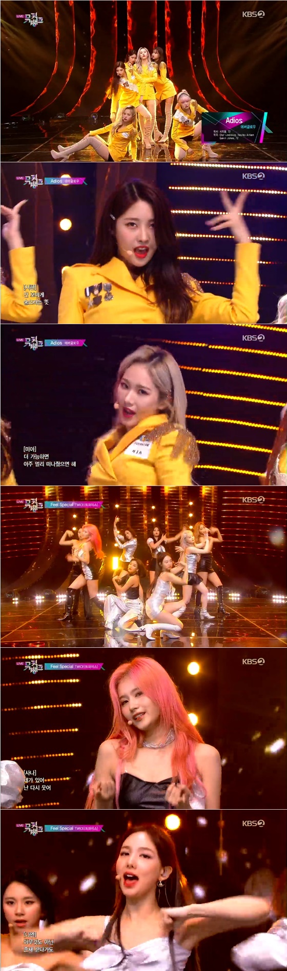 트와이스는 신곡 'Feel Special'에 대해 "지치고 힘들었던 내가 너를 만나서 스페셜해졌다는 내용을 담은 곡이다"라며 "이번 포인트 안무는 후렴부분에서 손을 뻗는 것이다"라고 소개했다. 이들은 'Feel Special'에 맞춰 응원을 전했다.