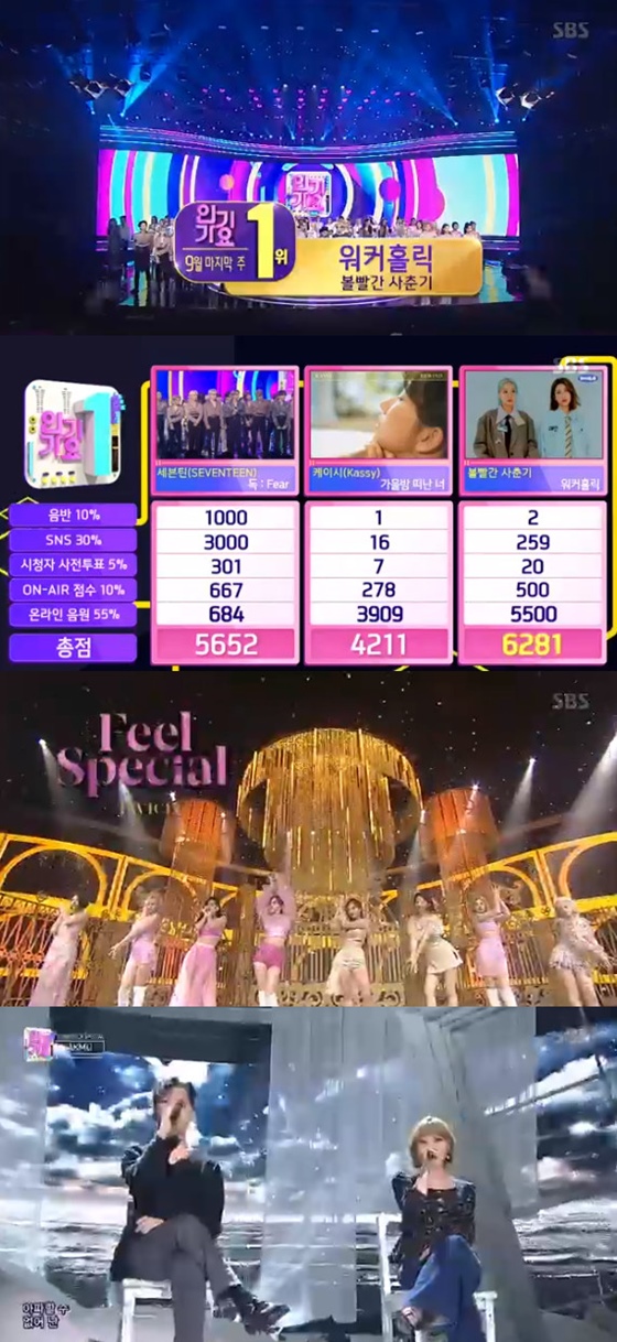 29일 방송된 SBS 가요 순위 프로그램 '인기가요'에서는 세븐틴, 케이시, 볼빨간사춘기가 1위 후보에 오른 가운데, 볼빨간사춘기가 '워커홀릭'으로 1위를 차지했다.