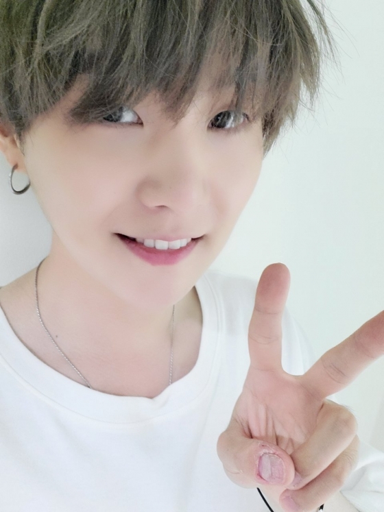 공개된 사진 속 슈가는 흰 티셔츠를 입고 손가락으로 브이를 그린 채 카메라를 응시하고 있는 모습이 담겼다. 특히 슈가는 순정만화 속 미소년 매력을 뽐내 시선을 사로잡는다.