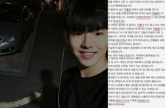 김동빈은 4일 자신의 인스타그램에 "꿈을 위해서 시즌2, X101 두번의 도전이 저는 당연하고 스스로 행복했었습니다"라는 말로 시작하는 장문의 글을 게재했다.