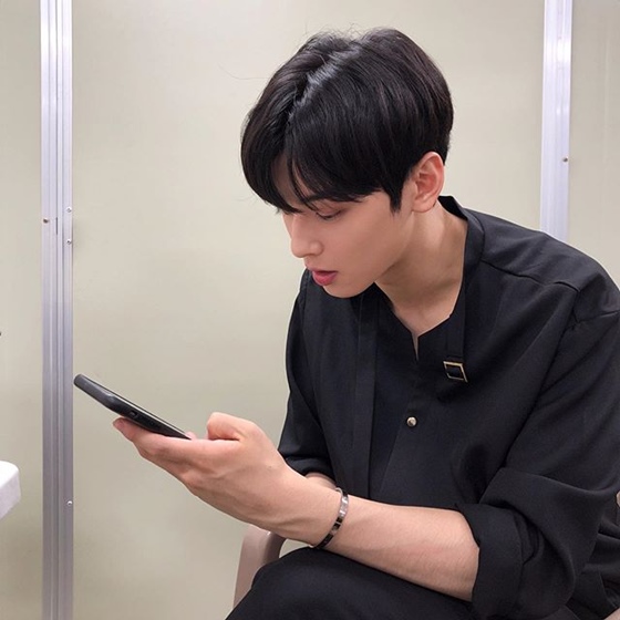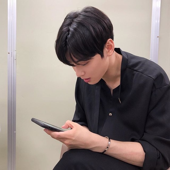 사진 속 차은우는 휴대폰을 집중해서 바라보고 있다. 블랙 슈트를 입은 모습이 단정한 매력을 돋보이게 한다. 예술 같은 옆선도 인상적이다.