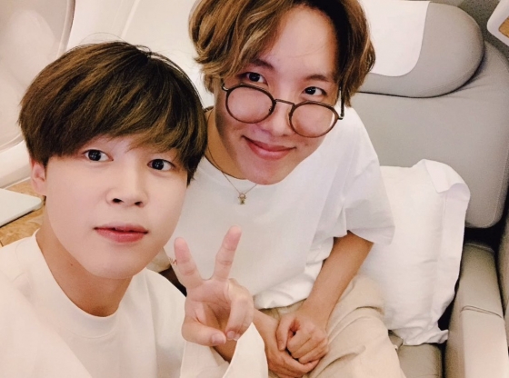 공개된 사진 속 제이홉과 지민은 기내서 다정한 포즈로 함께 셀카를 찍고 있는 모습이다. 손가락으로 브이를 그리고 있는 지민은 귀여운 표정으로 시선을 사로잡는다.