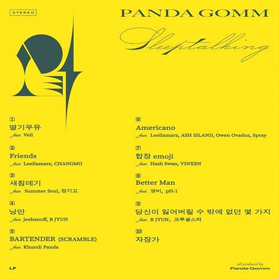 17알 레이블 goodtomeetyou(굿투미츄)에 따르면 판다곰은 오는 18일 오후 12시 각종 음원사이트를 통해 정기고, 영비, 창모, pH-1, 지바노프 등이 참여한 정규 앨범 'sleeptalking'을 발표한다.