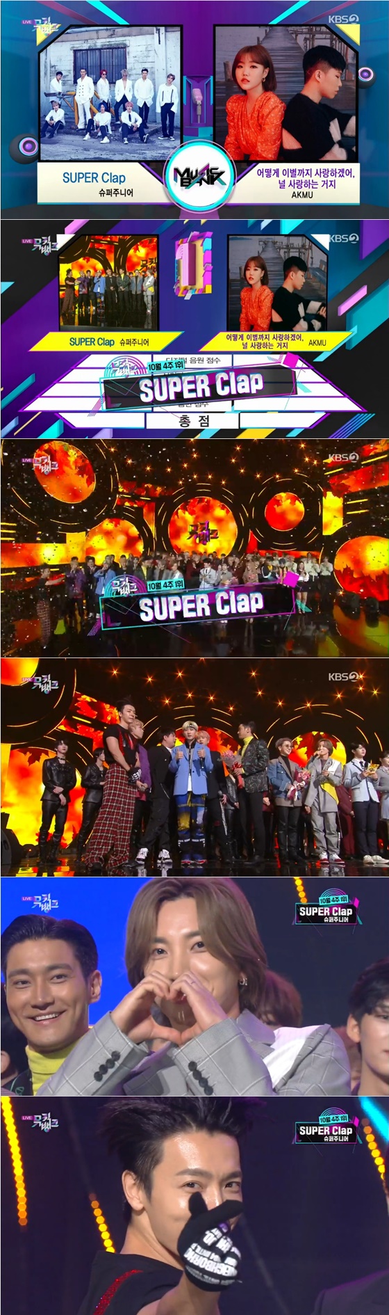 25일 오후 방송된 KBS 2TV 음악순위 프로그램 '뮤직뱅크'에서는 슈퍼주니어가 곡 'SUPER Clap'(슈퍼 클랩)으로 1위에 오르는 모습이 그려졌다. 이로써 슈퍼주니어는 지난 24일 엠넷 '엠카운트다운' 1위에 이어 음악방송 2관왕을 차지했다.