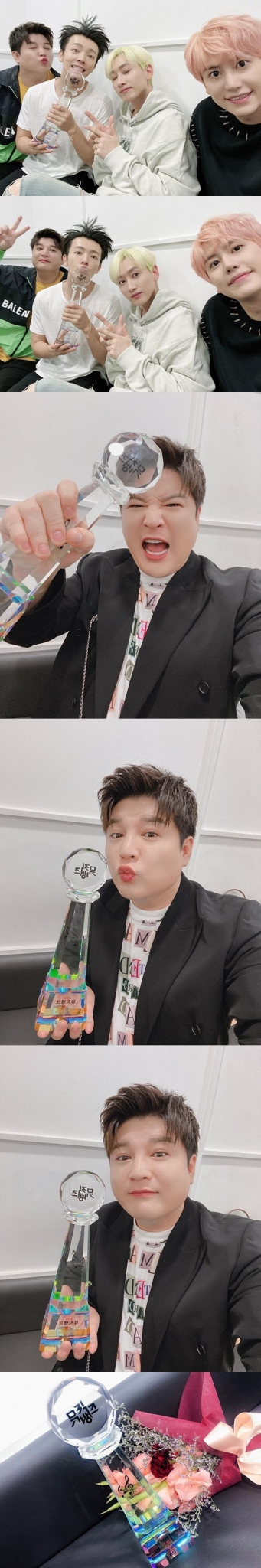 신동은 "#고마워 #1위 #뮤직뱅크 #슈퍼클랩 #신동 #슈퍼주니어"라는 글과 함께 두 장의 사진을 올렸다. 공개된 사진 속 신동은 '뮤직뱅크' 1위 트로피를 들고 익살스러운 포즈를 취하고 있다.