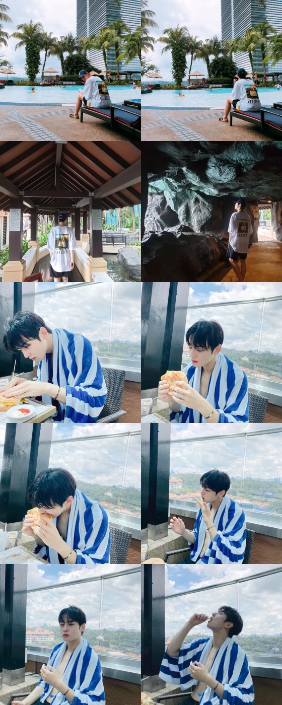 공개된 사진 속 차은우는 대형 비치타올을 걸치고 햄버거를 먹고 있거나, 수영장에서 화면을 응시하며 미소짓고 있다.
