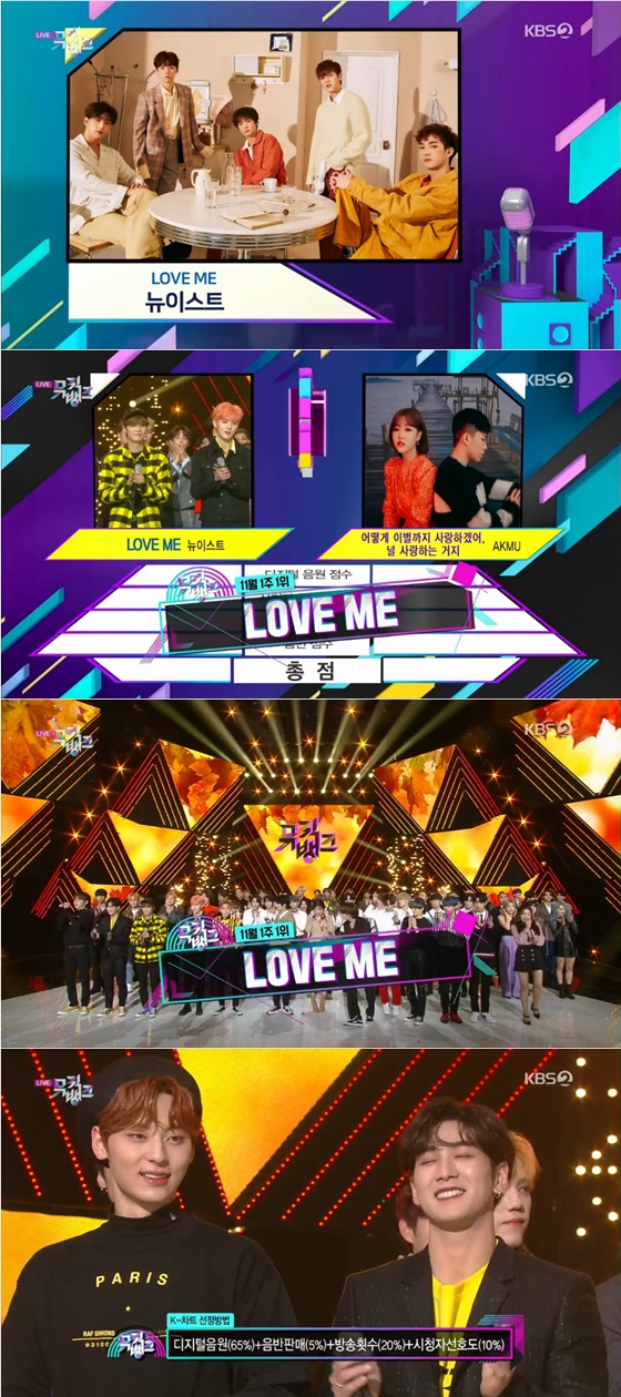 '뮤직뱅크' 뉴이스트가 곡 'LOVE ME'로 음악방송 3관왕에 올랐다.