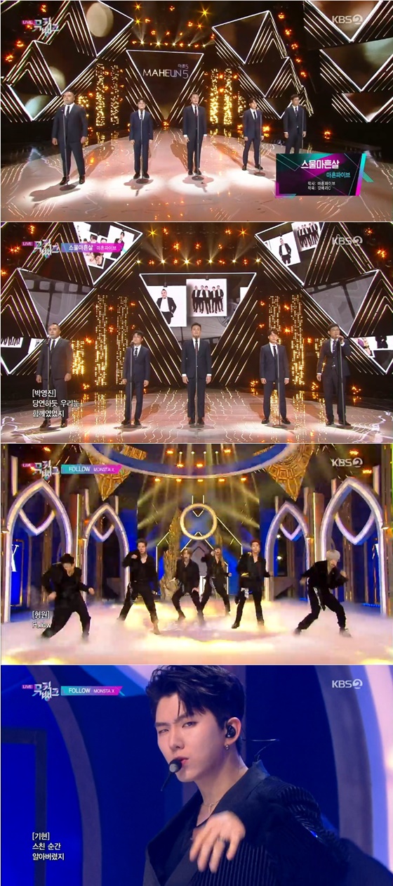 한편 이날 '뮤직뱅크'에서는 마흔파이브의 데뷔 무대와 몬스타엑스의 컴백 무대가 꾸며졌다. 먼저 마흔파이브는 무대에 앞서 "방탄소년단에게 아미(방탄소년단 팬클럽 이름)가 있다면, 마흔파이브에게는 맘(MOM)이 있다"고 소개했다. 이어 곡 '스물마흔살'에 대해 "미디엄 템포의 세미 트로트다. 두 번째 스무살을 맞이하는 추억을 노래했다"고 설명했다.