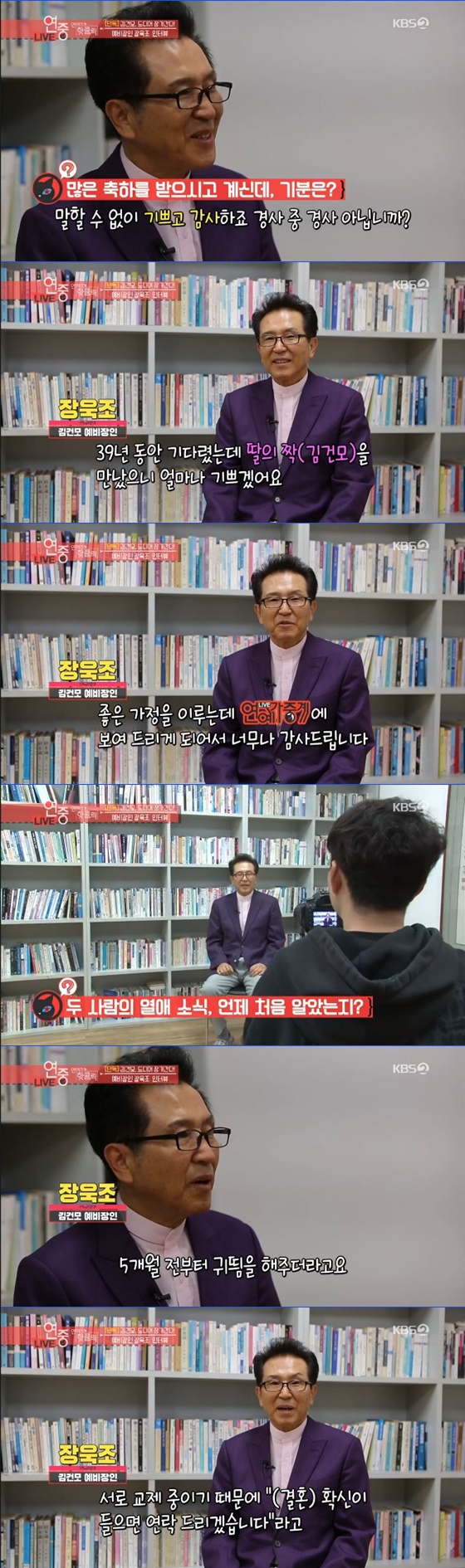 장욱조는 딸 장지연과 김건모의 열애를 처음 알게된 시점에 대해 "5개월 전부터 귀뜸을 해줬다. '남자가 생겼습니다'라고 말했다. 서로 교제 중이기 때문에 확신이 들면 연락을 주겠다고 했다. 한 달 전부터 김건모에게 자신이 필요하다라는 확신을 가졌다고 하더라"고 설명했다.
