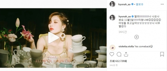 지난 3일 현아는 자신의 인스타그램에 "떨려!!!!! 나 나오나 봐요 11월 5일!!!!! 아잉들 보고 싶어ㅠㅠ 나 너무 떨린다"라는 글과 함께 티저 영상을 게재했다.
