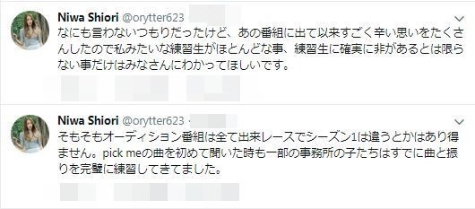 이후 니와 시오리는 지난 8일 자신의 트위터에 "말주변이 없어서 오해를 불러 일으킬만한 트윗이 돼버렸다면 정말 죄송하다"며 "단지 제작자와 기획사 사람들이 거래를 한 것 뿐이고 연습생들은 아무것도 모른 채 휘둘렸다는 것을 말하고 싶었다. 데뷔조 아이들도 똑같이 힘들어했다. 연습생은 아무 잘못이 없다"고 해명했다.