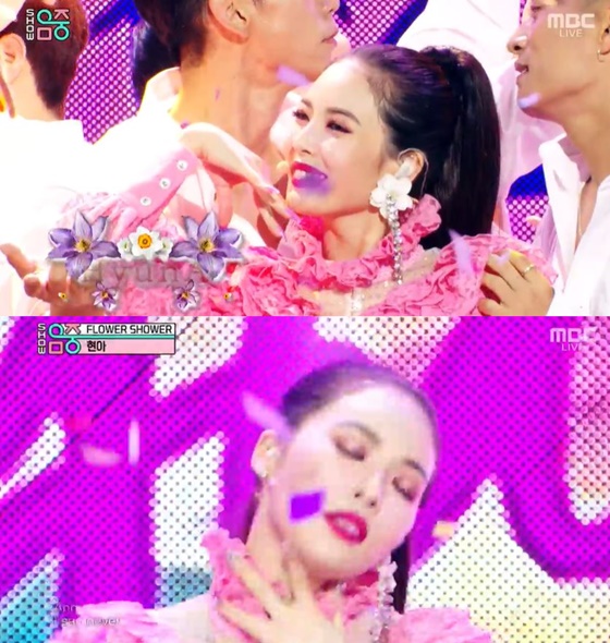 9일 오후 방송된 MBC 음악순위프로그램 '쇼!음악중심'에서 현아는 곡 'FLOWER SHOWER'으로 '무대 장인'의 모습을 선보였다.