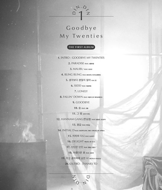 딘딘은 13일 개인 SNS 계정을 통해 오는 20일 발매되는 첫 정규앨범 'Goodbye My Twenties(굿바이 마이 트웬티스)' 트랙리스트 이미지를 게재했다.