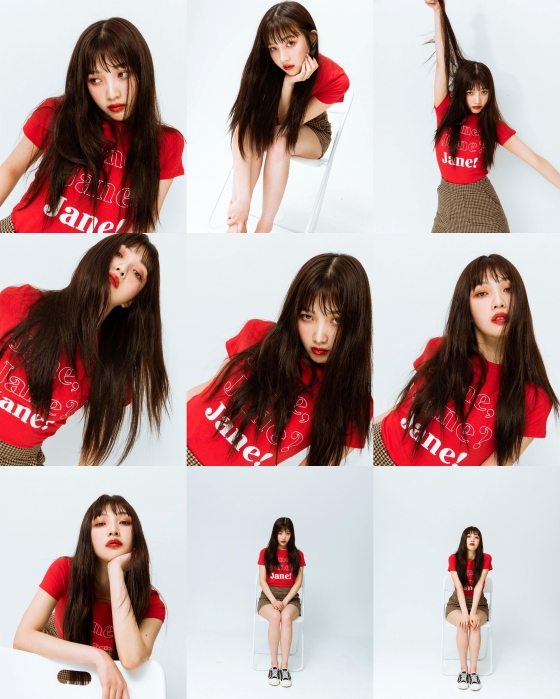 사진 속 조이는 빨간색 반팔 티셔츠와 갈색 체크 치마를 입고 매혹적인 표정을 짓고 있다.