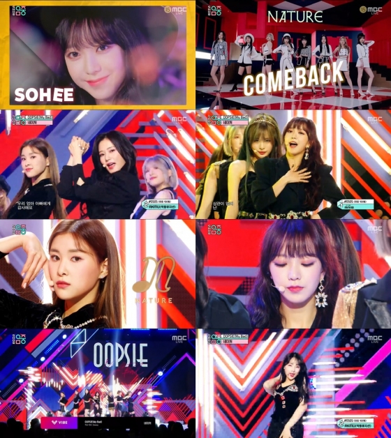 걸그룹 네이처는 16일 방송된 MBC '쇼! 음악중심'에서 두 번째 미니 앨범' NATURE WORLD: CODE A' 타이틀 곡 'OOPSIE(My Bad)' 무대를 선보였다.