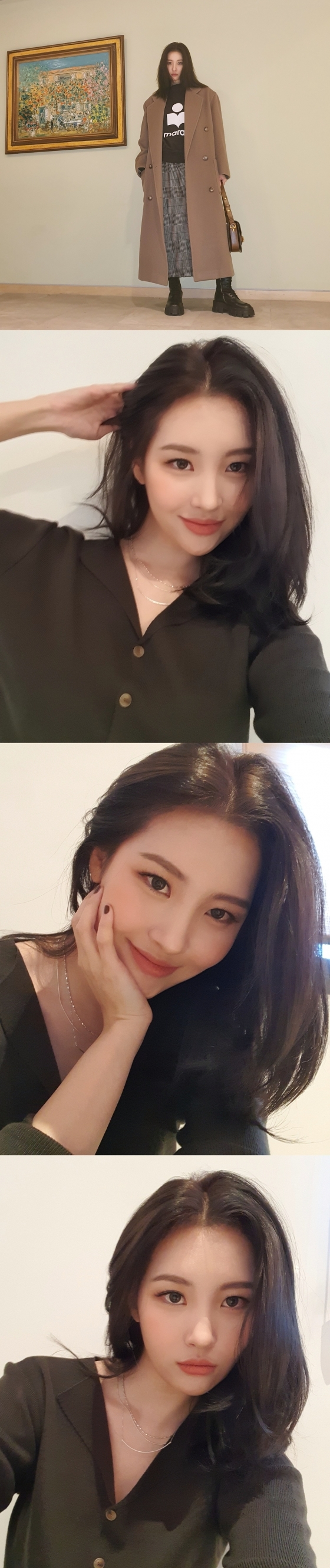 공개된 사진 속 선미는 흑발로 염색한 모습을 공개했다. 늦가을 분위기에 맞는 갈색 코트와 머리색과 어울리는 검은색 반팔에 치마까지 소화해 시크한 모습을 강화했다.