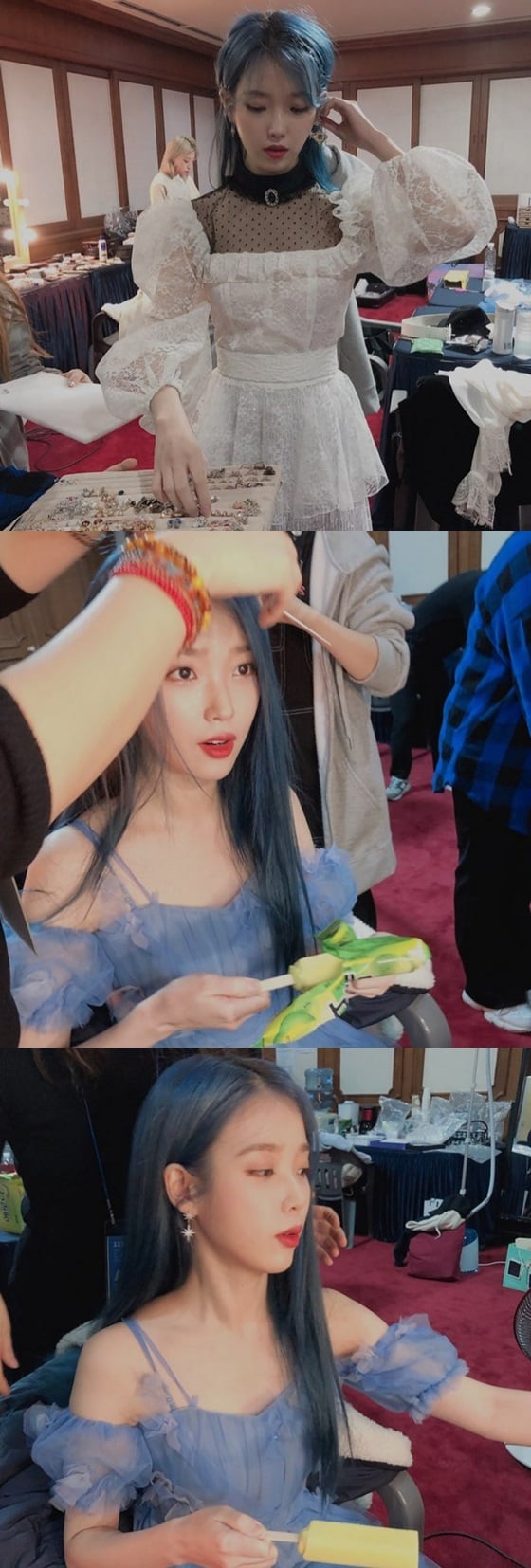 공개된 사진 속 아이유는 공연장 대기실에서 악세사리를 고르고 있다. 중세 공주 풍의 흰색 레이스 의상에 파란색 염색을 한 헤어스타일이 사이버 공간에 등장하는 캐릭터 같은 느낌을 준다.