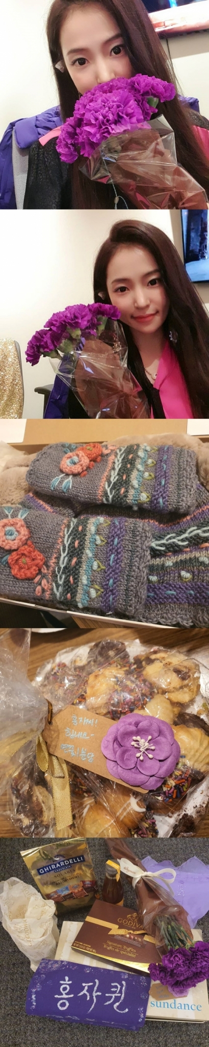 공개된 사진 속 홍자는 보라색 꽃다발을 들고 셀카를 찍고 있다. 또 팬들이 준 초콜릿과 뜨개질한 장갑, 쿠키 사진을 공개했다.
