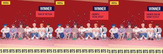 방탄소년단은 24일(현지 시각) 미국 로스앤젤레스 마이크로소프트 공연장에서 열린 '2019 아메리칸 뮤직 어워즈(이하 2019 AMAs)'에서 ▲페이보릿 듀오·그룹 팝·록 부문(Favorite Duo/Group) ▲올해의 투어(Tour Of The Year) 부문 ▲페이보릿 소셜 아티스트(Favorite Social Artist) 부문에서 수상했다.