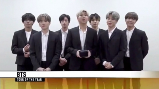 방탄소년단은 이날 올해의 투어(Tour Of The Year) 수상 소감으로 "투어와 함께 한 멋진 한 해였다. 세계 각국에서 정말 많은 여러분을 만날 수 있어 영광이었다. 투어는 끝났지만, 자신을 사랑한 방법을 찾아야 한다는 그 메시지는 영원히 곁에 남길 바란다"라고 전했다.