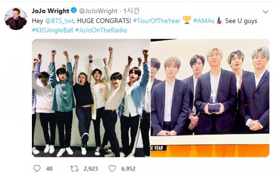 미국 로스엔젤레스 'JoJo On The Radio' 쇼 호스트 JoJo Wright도 방탄소년단을 축하했다. 그는 24일(현지 시각) 자신의 SNS에 "방탄소년단, 정말 크게 축하한다! #올해의투어상 #AMAs 다음에 보자 #징글볼 #조조온더라디오(Hey @BTS_twt, HUGE CONGRATS! #TourOfTheYear #AMAs See U guys #KIISJingleBall #JoJoOnTheRadio)"라는 글을 남겼다.