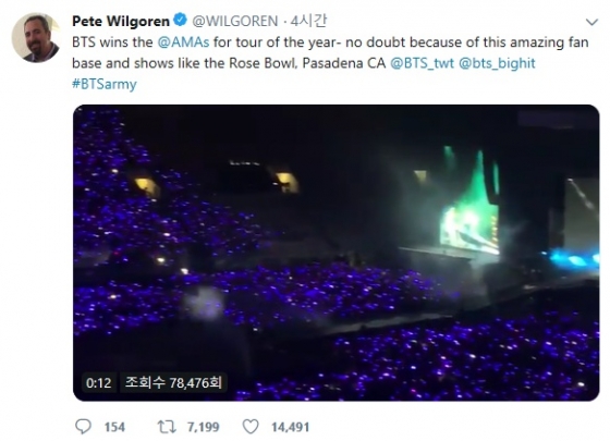 미국 'FOX 11 Los Angeles' TV 방송 편집자 Pete Wilgoren은 24일(현지 시각) "BTS는 2019 AMAs에서 올해의 투어(TOUR OF THE YEAR) 부문을 수상했다. - 미국 캘리포니아주 패서디나에 있는 로즈 볼 스타디움 공연에서와 같은 놀라운 팬층이 있기 때문에 의심할 일도 아니다. (BTS wins the @AMAs for tour of the year- no doubt because of this amazing fan base and shows like the Rose Bowl, Pasadena CA)"라며 방탄소년단 팬덤인 아미들을 언급했다.