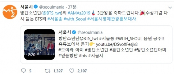 먼저 서울시는 25일 트위터에 "방탄소년단(@BTS_twt)의 #AMAs2019 3관왕을 축하드립니다. 수상기념 다시 듣는 BTS의 #서울송 #with_Seoul #서울시명예관광홍보대사"라며 방탄소년단이 부른 서울시 홍보곡 'WITH SEOUL' 영상을 첨부했다.