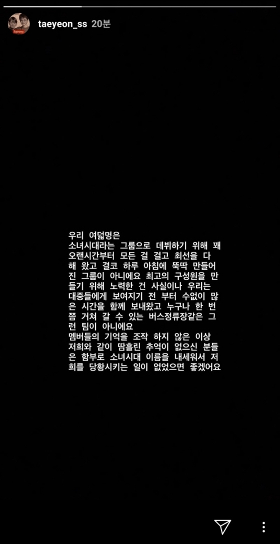 29일 태연은 자신의 인스타그램에 "우리 8명은 소녀시대라는 그룹으로 데뷔하기 위해 꽤 오랜 시간부터 모든 걸 걸고 최선을 다해왔다. 결코 하루아침에 뚝딱 만들어진 그룹이 아니다"라며 "최고의 구성원을 만들기 위해 노력한 건 사실이나 우리는 대중들에게 보이기 전부터 수없이 많은 시간을 함께 보내왔고 누구나 한 번쯤 거쳐 갈 수 있는 버스정류장 같은 그런 팀이 아니다"라고 설명했다.