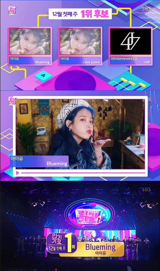 12월 1일 오후 방송된 SBS 음악순위 프로그램 '인기가요'에서는 아이유가 곡 'Blueming'으로 1위에 오르는 모습이 그려졌다.