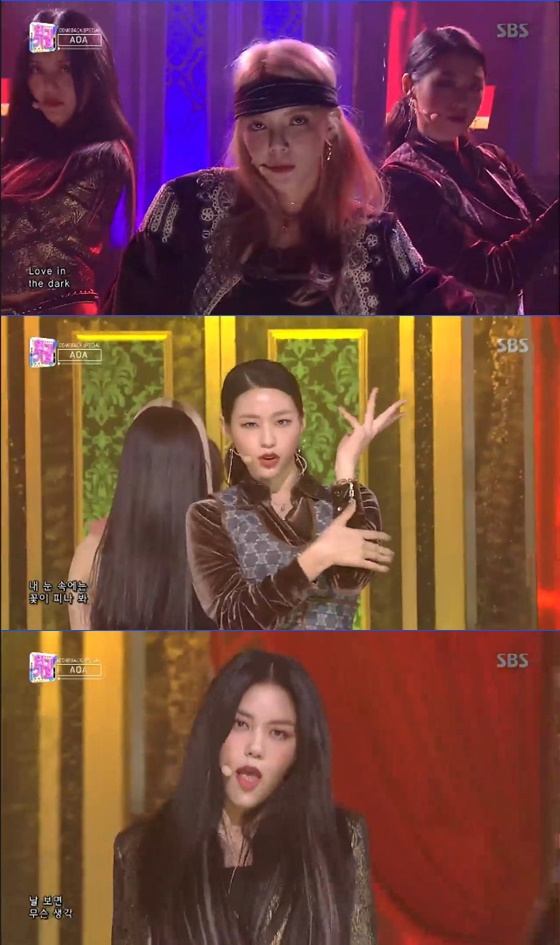 또한 AOA는 포인트 안무로 '뉴 문 댄스'를 꼽았다. AOA는 "손으로 다리를 그리는 것"이라고 설명하며 포인트 안무인 '뉴 문 댄스'를 선보여 시선을 끌었다. AOA는 '날 보러 와요' 무대로 걸크러시 면모를 뽐냈다.