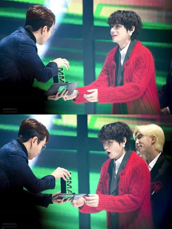 공개된 사진 속 장성규는 지난 2019 MMA 시상식에서 뷔에게 트로피를 전하고 있다. 환하게 웃는 장성규와 뷔의 미소가 훈훈함을 자아낸다.