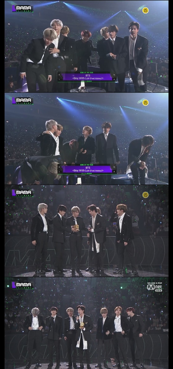 '2019 마마' 첫 시상이었던 베스트 남자 그룹상을 받은 방탄소년단은 "처음 상부터 받게 되서 영광이다. 후보에 쟁쟁한 분들 많았는데 상을 받게 되서 영광이다"라고 소감을 밝혔다. 특히 이날 생일을 맞은 방탄소년단 멤버 진은 "제 생일에 저희 멤버들과 아미(방탄소년단 팬클럽 이름) 여러분들과 함께 할 수 있어서 너무 감사하다. 저희에게 이 상을 주신 마마도 감사하다"고 힘을 보탰다.