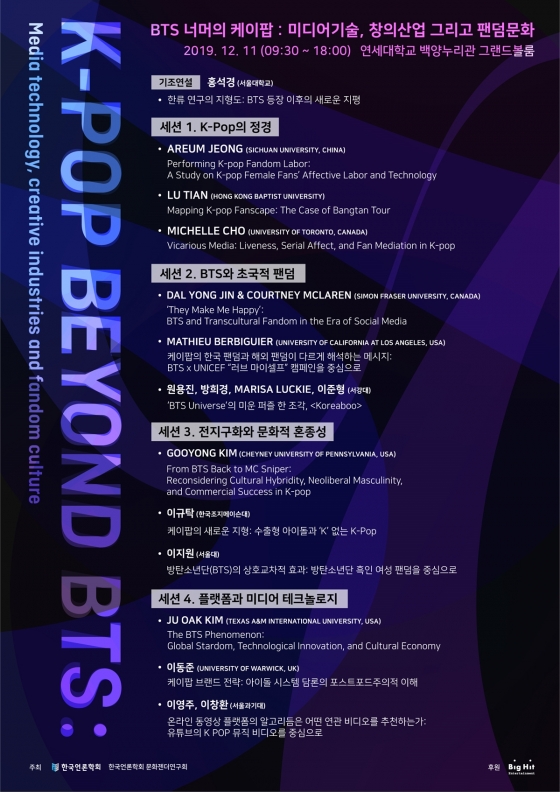 'BTS 너머의 케이팝: 미디어기술, 창의산업 그리고 팬덤문화'라는 이름으로 열리는 이번 세미나는 '21세기 비틀스'로 불리는 방탄소년단이 만들어낸 아이코닉한 문화 현상에 대해 다룬다. 방탄소년단 등장 이후 K팝 관련 논의가 어떻게 발전, 확장하고 있는지 학계의 다층적인 관점에서 토의하는 장으로 마련됐다.