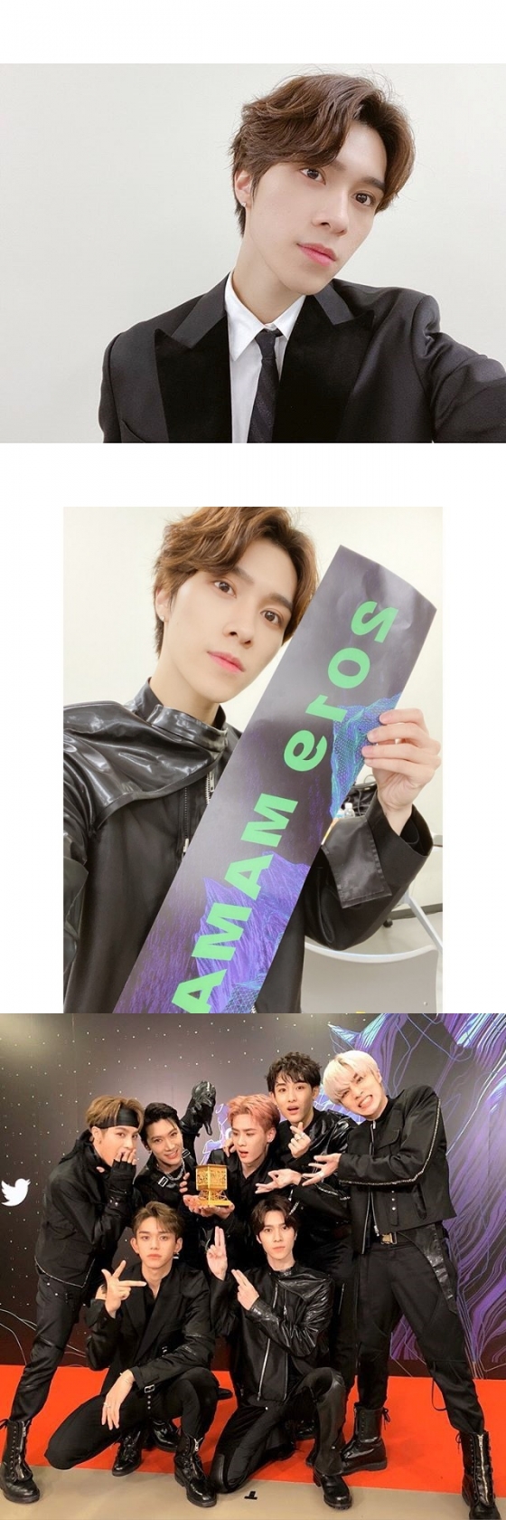 공개된 사진 속 헨드리는 '2019 MAMA' 플래카드를 들고 짙은 이목구비를 뽐내고 있다. 마지막 사진에는 멤버들 전체 사진을 삽입해 훈훈함을 보였다.