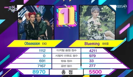 엑소는 6일 오후 방송된 KBS 2TV 음악순위 프로그램 '뮤직뱅크'에서 곡 '옵세션'(Obsession)으로 아이유의 곡 'Blueming'을 꺾고 1위를 차지했다.