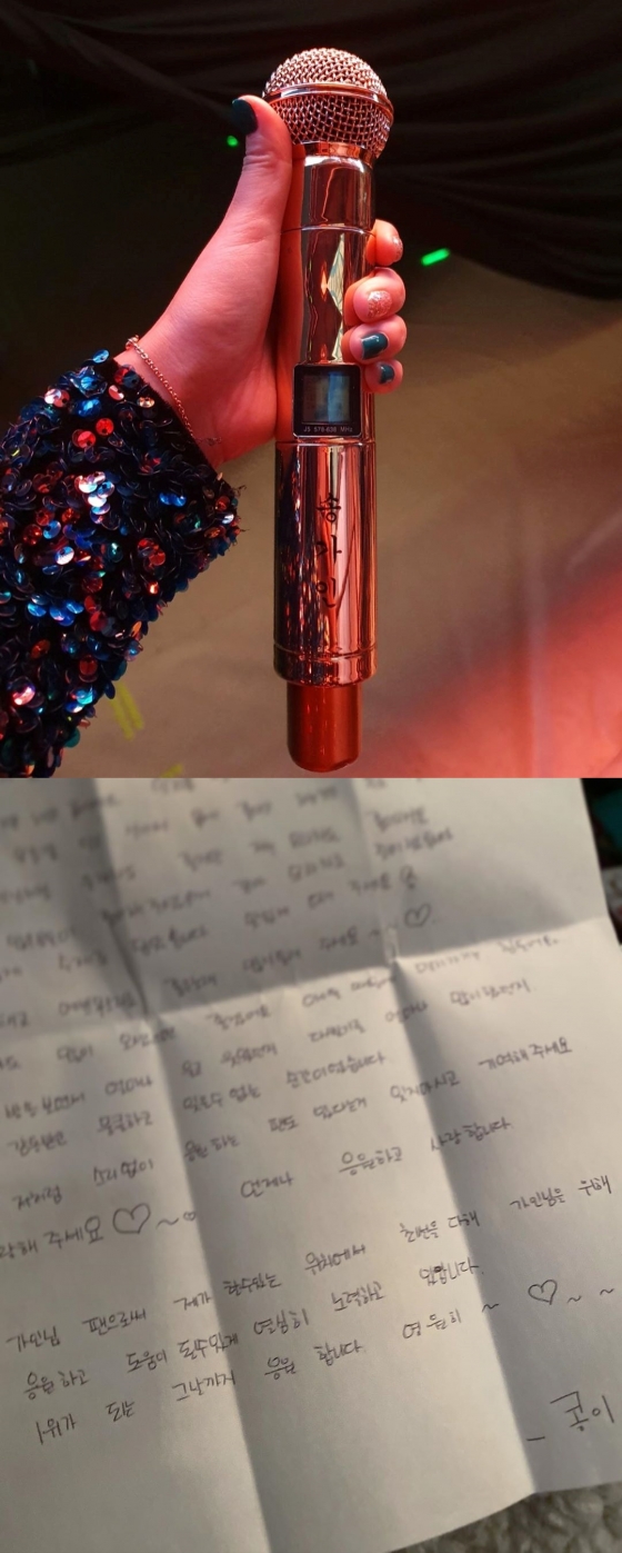 공개된 사진 속 송가인은 자신의 이름이 새겨진 금색 마이크를 들고 사진을 찍었다. 이어 한 팬으로부터 받은 팬의 편지 일부 내용을 공개했다.