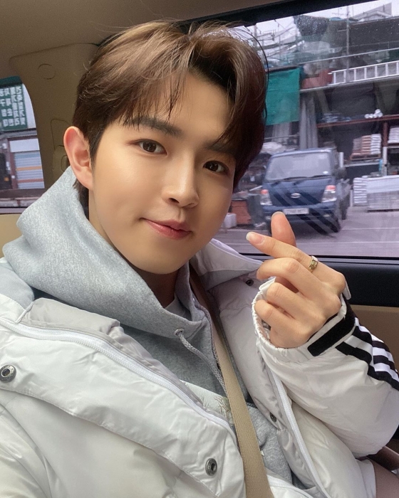 공개된 사진 속 김재환은 손가락으로 하트를 만들고 있다. 흰색 패딩과 후드 맨투맨을 입고 환하게 웃는 표정이 눈에 띈다.
