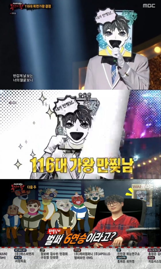 지난 8일 오후 방송된 MBC 예능 프로그램 '복면가왕'에서 만찢남은 3라운드 결승전 무대에서 아이유의 '나만 몰랐던 이야기'를 선곡, 유산슬과의 대결에서 승리하며 116대 복면가왕에 등극됐다.