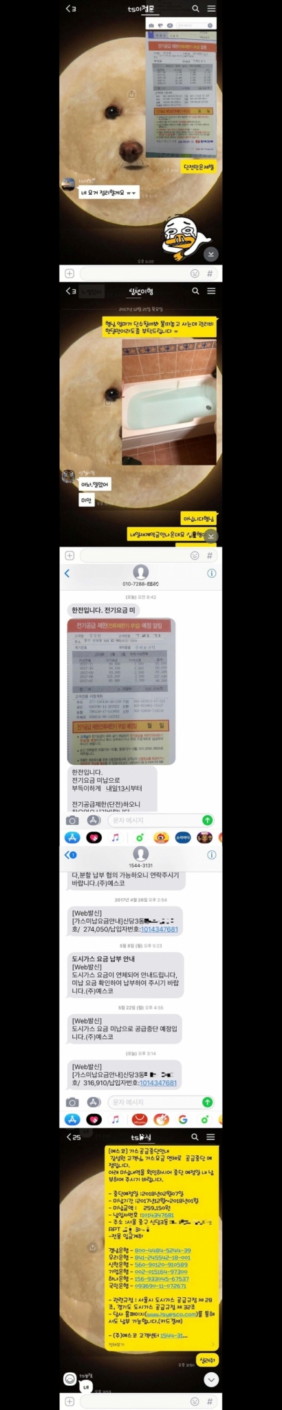 공개된 사진에는 TS 소속사 측에 단전을 막아달라고 호소하거나, 관리비를 부탁하는 내용이 담겨 있다. 한국전력공사로부터 받은 전기 요금 미납 문자나 예스코로부터 받은 가스 요금 연체으로 중단된다는 내용도 포함되어 있다.